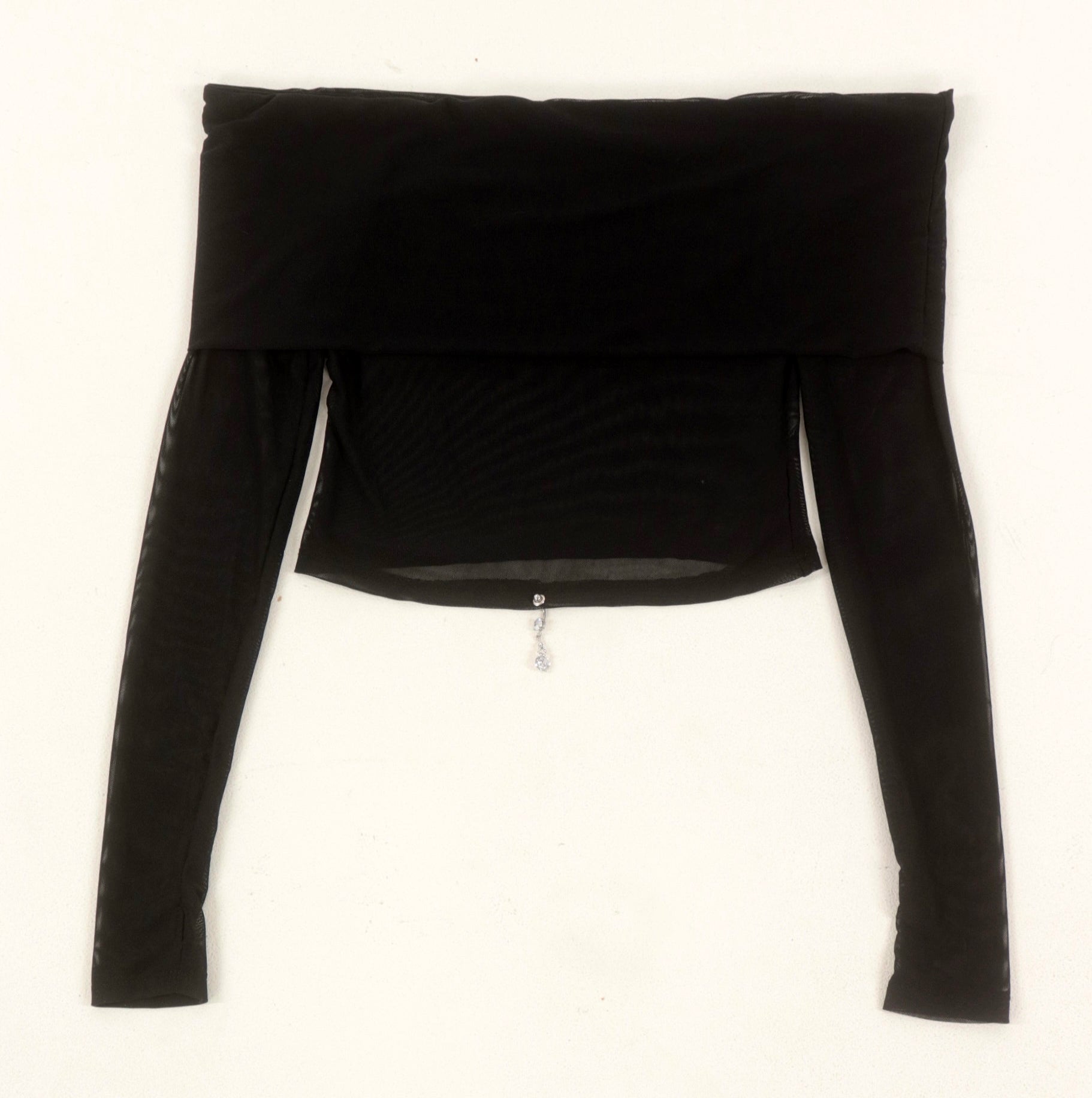 Our sheer mesh top folds down the bust for extra coverage. The off-shoulder top has thumb holes and is embellished with a navel piercing. Paired with PAS DE TRASH SKIRT.