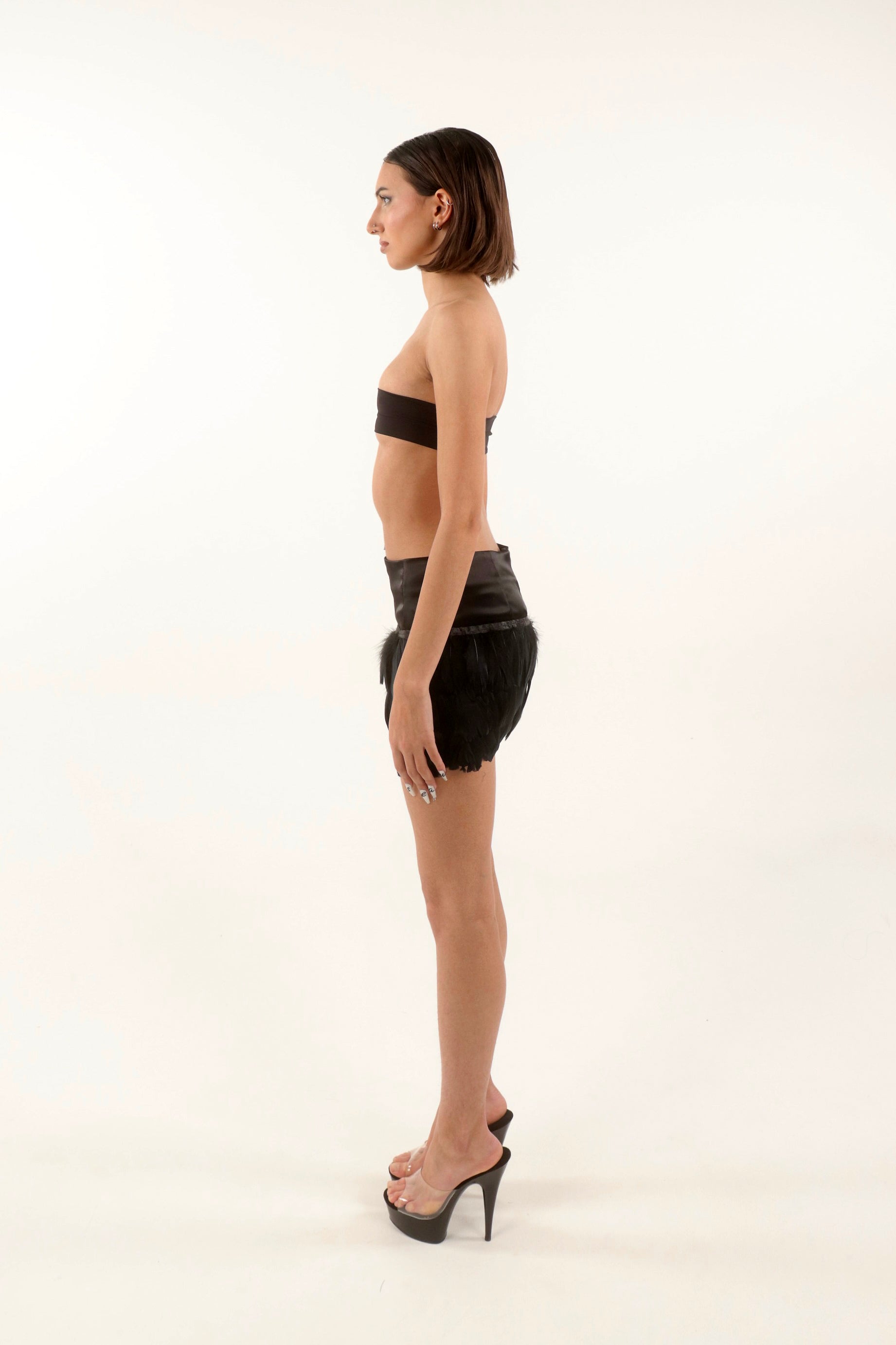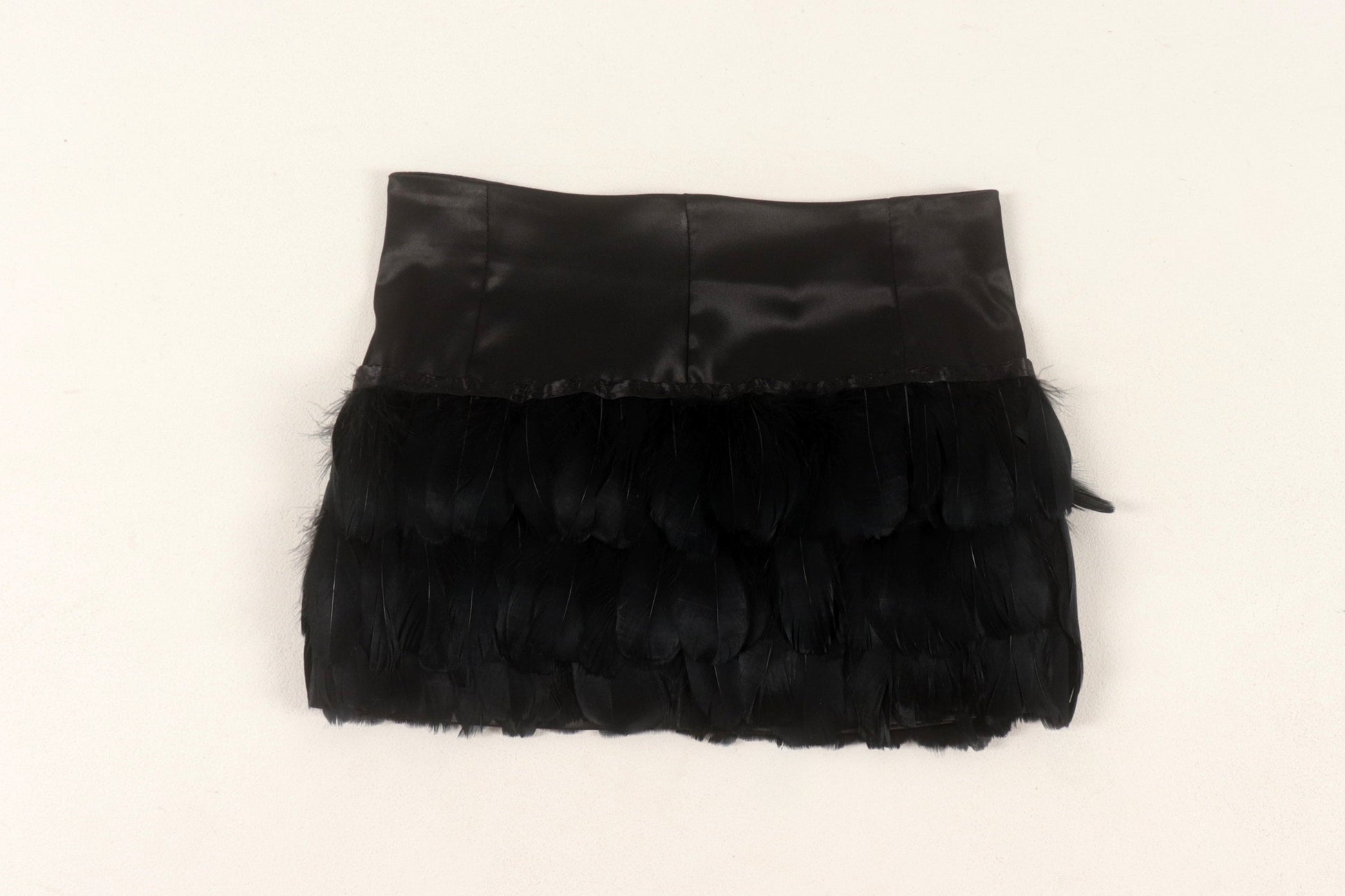 Satin mini skirt trimmed with black feathers. Our feathers are sourced from Feather.com.au, a small business in Australia. Their feathers are a bi product, meaning birds are not harmed for their feathers.