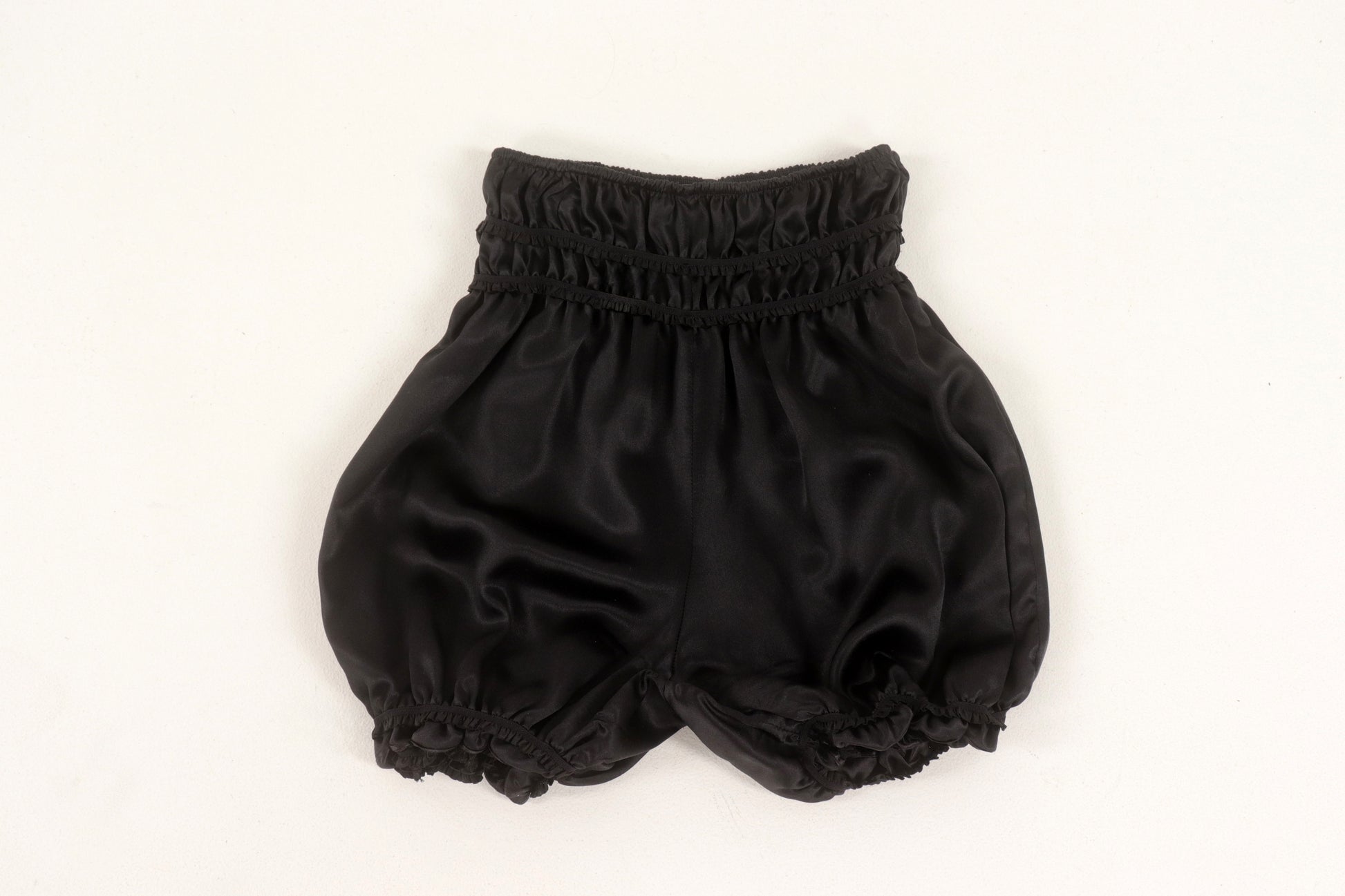 Mulberry silk bloomers detailed with elastic ruffles on the waist and thighs.